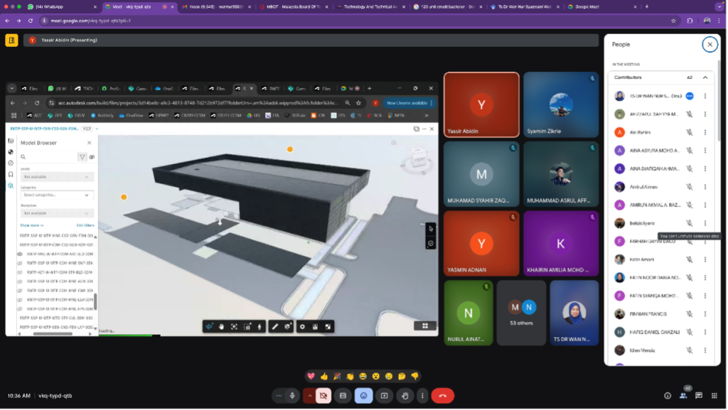 Sesi perkongsian ilmu yang diadakan secara maya melalui platform Google Meet ini disertai oleh lebih 60 pelajar dan pensyarah Kursus BIM. ACC merupakan platform bersepadu yang mengintegrasikan pelbagai proses pembinaan dari peringkat reka bentuk hingga penyerahan projek. Wakil Gamuda Engineering Sdn Bhd berkongsi tatacara penggunaan ACC dan kepentingan penyimpanan maklumat pembinaan dalam platform tersebut. Mereka turut menyediakan model kejuruteraan untuk latihan pelajar mengaplikasikan ACC sebagai cloud-based collaboration tools.