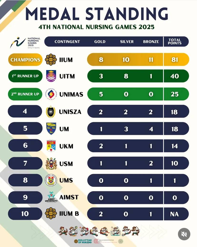Tahniah dan syabas diucapkan kepada semua atlet, penyokong dan staf pengiring yang telah mengharumkan nama UiTM di peringkat nasional. Semoga pencapaian ini menjadi sumber inspirasi dan motivasi kepada seluruh warga kejururawatan untuk terus mencipta kejayaan yang lebih gemilang pada masa akan datang.
