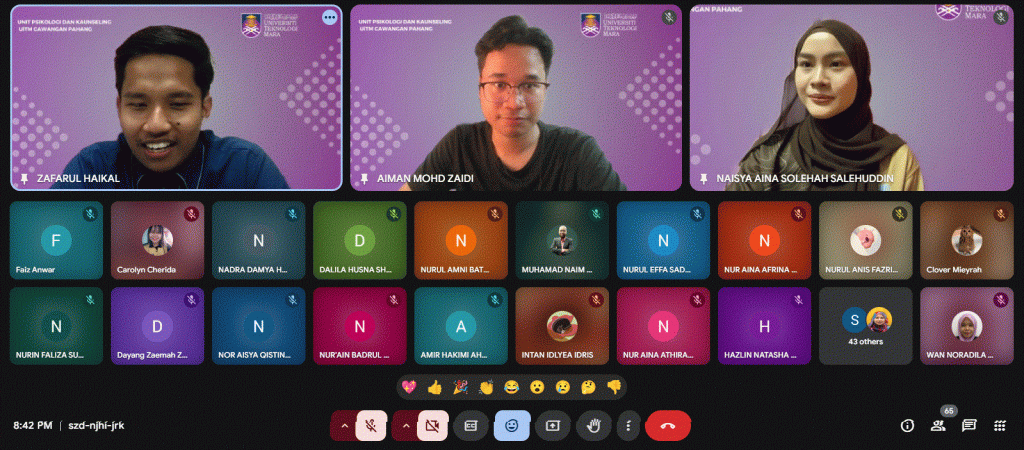 Jengka, 7 Mei 2025 – UiTM Cawangan Pahang Kampus Jengka terus komited memperkukuh kesejahteraan pelajar melalui penganjuran Program Saringan dan Intervensi Kesihatan Mental, yang telah dilaksanakan secara dalam talian. Program ini menyasarkan pelajar semester 1, namun turut dibuka kepada semua mahasiswa UiTM Kampus Jengka bagi meningkatkan kesedaran dan kemahiran dalam pengurusan emosi serta tekanan. Program ini telah berjaya menarik penyertaan seramai 272 pelajar secara keseluruhan, merangkumi 116 pelajar pada 7 Mei 2025 dan 156 pelajar pada 10 April 2025.