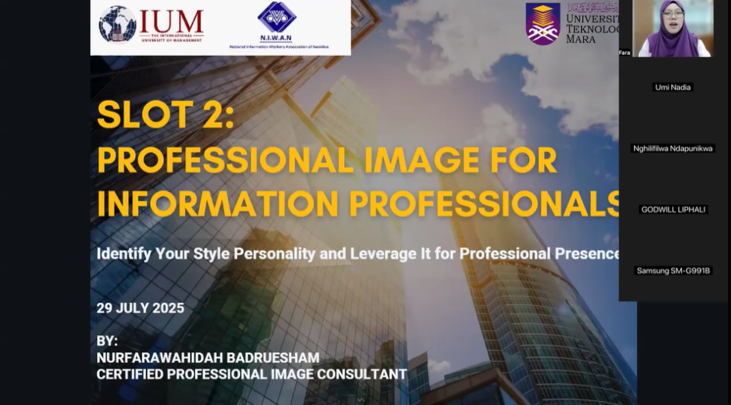 JENGKA, 1 August 2025 – Al-Bukhari Library, Universiti Teknologi MARA (UiTM) Pahang Branch, Jengka Campus, proudly represented Malaysia in a global knowledge-sharing initiative through an Online Public Lecture hosted by the International University of Management (IUM), Namibia, in collaboration with the National Information Workers Association of Namibia (NIWAN).